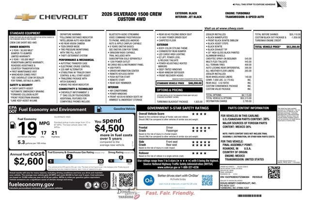 All-Terrain Tires, 10-Way Power Driver Seat with Lumbar, 120-Volt Bed Mounted Power Outlet, 120-Volt Interior Power Outlet, 3.5 Monochromatic Display Driver Info Center, 4 Black Round Assist Steps, 40/20/40 Front Split-Bench Seat, All-Weather Floor Liner, Auto-Locking Rear Differential, Black Chrome Exhaust Tip, Black Name Plates, Bluetooth® For Phone, Chevytec Spray-on Black Bedliner, Cloth Seat Trim, Color-Keyed Carpeting Floor Covering, Custom Convenience Package, Custom Value Package, Dark Essentials Package, Deep-Tinted Glass, Dual Rear USB Ports (charge Only), Electric Rear-Window Defogger, Electronic Cruise Control, Emergency communication system: OnStar, EZ Lift Power Lock and Release Tailgate, Front Black Bowtie Emblem, Front Frame-Mounted Black Recovery Hooks, Front Rubberized Vinyl Floor Mats, HD Rear Vision Camera, Hitch Guidance, LED Cargo Area Lighting, Manual Tilt Wheel Steering Column, Multi-Flex Tailgate, OnStar Services Capable, Power Front Windows with Driver Express Up/Down, Power Front Windows with Passenger Express Down, Power Rear Windows with Express Down, Preferred Equipment Group 1CX, Rear 60/40 Folding Bench Seat (folds Up), Rear Rubberized-Vinyl Floor Mats, Rear Wheelhouse Liners, Remote Keyless Entry, Remote Vehicle Starter System, SiriusXM Trial Subscription, Standard Tailgate, Teen Driver, Theft Deterrent System (unauthorized Entry), Tire Pressure Monitoring System, Trailering Package, Turbomax Blackout Package, Wheels: 20 x 9 High Gloss Black Painted Aluminum, Wi-Fi Hot Spot Capable. Shop New Chevrolet Vehicles at Doug Henry Chevrolet Tarboro — One Simple Price, No-Haggle Deals, and Transparent Online Pricing in Eastern North Carolina. (Valid Through 04/30/2026. Please call to verify pricing and availability.) Find the best new Chevrolet deals in Tarboro, Rocky Mount, Greenville, Wilson, Raleigh, and Eastern North Carolina with our One Simple Price—your upfront, competitive, no-haggle price on every new Chevy truck, SUV, crossover, and EV. Explore top models like the Silverado 1500, Silverado 2500HD, Colorado, Equinox, Trax, Traverse, Blazer, Tahoe, Suburban, Malibu, Camaro, Corvette, and Bolt EV. Inventory updates daily with real-time Chevrolet pricing. Customers choose Doug Henry Chevrolet Tarboro for: Upfront, no-haggle Chevrolet pricing Fast online shopping with real inventory Home delivery options A non-commissioned, pressure-free team A trusted, transparent Chevrolet buying experience For the most accurate Chevrolet pricing and incentives, visit DougHenryTarboro.com. Third-party sites may not update offers as quickly. Every new Chevrolet purchase includes our 5-Day Money-Back Guarantee for added confidence. Pricing & Financing Details: Advertised prices exclude taxes, tags, and a $788 administrative fee. Additional Chevrolet incentives, regional discounts, loyalty offers, and finance programs may apply. Ask how to maximize your savings. We are committed to transparent dealership pricing, no-haggle offers, and a smooth buying experience for shoppers searching for new Chevy trucks, SUVs, and cars in Eastern North Carolina. Check our customer reviews to see why buyers choose Doug Henry Chevrolet Tarboro.