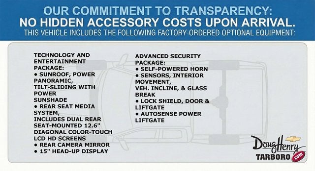 15 Diagonal Multi-Color Head-Up Display, 20 x 9 Polished Aluminum Wheels, 3-Spoke Wrapped Steering Wheel, 3rd Row 60/40 Power-Folding Split-Bench Seat, Advanced Security Package, Apple CarPlay/Android Auto, Auto-Dimming Inside Rear-View Mirror, AutoSense Hands-Free Power Liftgate, Chrome Mirror Caps, Color-Keyed Carpeting Floor Covering, Dual Exhaust System, Dual-Pane Power Panoramic Sunroof, Emergency communication system: OnStar and Chevrolet connected services capable, Floor Console, Front LED Fog Lamps, Glass Breakage Sensor, Heated 2nd Row Outboard Seats, Heated Steering Wheel, Interior Camera, Key Card, LED Tail Lamps, Magnetic Ride Control Suspension, Memory Settings, Outside Heated Power-Adjustable Mirrors, Power Release 2nd Row Bucket Seats, Preferred Equipment Group 1LZ, Radio: 17.7 Diagonal Advanced Color LCD Display, Rear Power Liftgate, Rear Seat Media System, Remote Start, Technology & Entertainment Package, Technology Package, Theft-Deterrent Alarm System, Universal Home Remote, Vehicle Inclination Sensor, Vehicle Interior Movement Sensor, Wireless Phone Charging. Shop New Chevrolet Vehicles at Doug Henry Chevrolet Tarboro — One Simple Price, No-Haggle Deals, and Transparent Online Pricing in Eastern North Carolina. (Valid Through 02/02/2026. Please call to verify pricing and availability.) Find the best new Chevrolet deals in Tarboro, Rocky Mount, Greenville, Wilson, Raleigh, and Eastern North Carolina with our One Simple Price—your upfront, competitive, no-haggle price on every new Chevy truck, SUV, crossover, and EV. Explore top models like the Silverado 1500, Silverado 2500HD, Colorado, Equinox, Trax, Traverse, Blazer, Tahoe, Suburban, Malibu, Camaro, Corvette, and Bolt EV. Inventory updates daily with real-time Chevrolet pricing. Customers choose Doug Henry Chevrolet Tarboro for: Upfront, no-haggle Chevrolet pricing Fast online shopping with real inventory Home delivery options A non-commissioned, pressure-free team A trusted, transparent Chevrolet buying experience For the most accurate Chevrolet pricing and incentives, visit DougHenryTarboro.com. Third-party sites may not update offers as quickly. Every new Chevrolet purchase includes our 5-Day Money-Back Guarantee for added confidence. Pricing & Financing Details: Advertised prices exclude taxes, tags, and a $788 administrative fee. Additional Chevrolet incentives, regional discounts, loyalty offers, and finance programs may apply. Ask how to maximize your savings. We are committed to transparent dealership pricing, no-haggle offers, and a smooth buying experience for shoppers searching for new Chevy trucks, SUVs, and cars in Eastern North Carolina. Check our customer reviews to see why buyers choose Doug Henry Chevrolet Tarboro.
